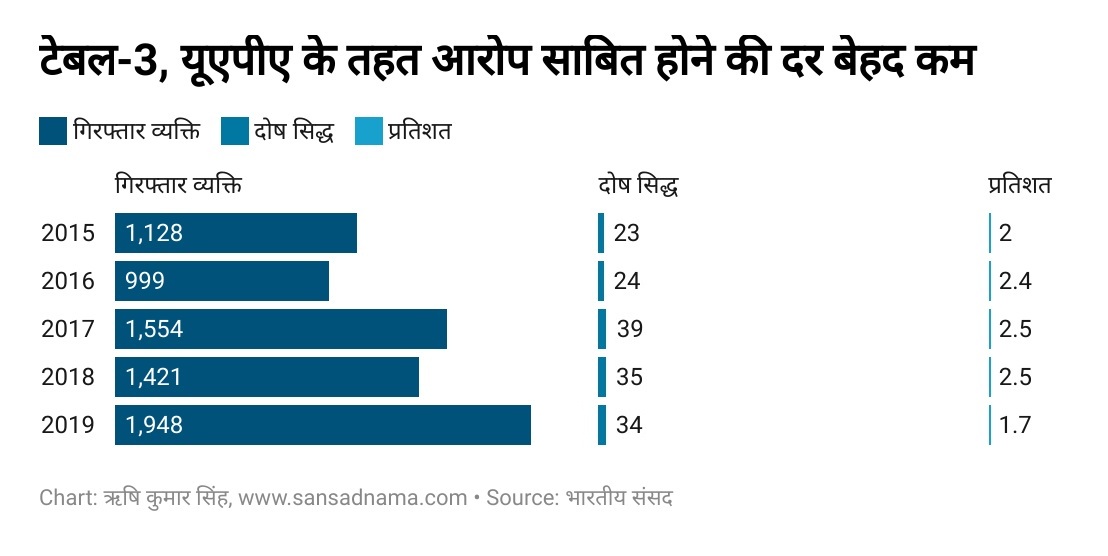 संसद में पेश आंकड़ों के मुताबिक, 2015 में 1128 लोग गिरफ्तार हुए और दोषी पाए गए व्यक्तियों की संख्या दो प्रतिशत यानी 23 रही. वहीं, 2016 में 999 लोग गिरफ्तार हुए, जबकि दोषी पाए गए व्यक्तियों की संख्या 2.4 प्रतिशत यानी 24 रही. इसी तरह 2017, 2018 और 2019 में गिरफ्तारी के मामले बेतहाशा बढ़े, लेकिन दोष सिद्ध व्यक्तियों की संख्या क्रमश: 39 (2.5 फीसदी), 35 (2.46 फीसदी) और 34 (1.74 फीसदी) रही. (देखें: टेबल-3)