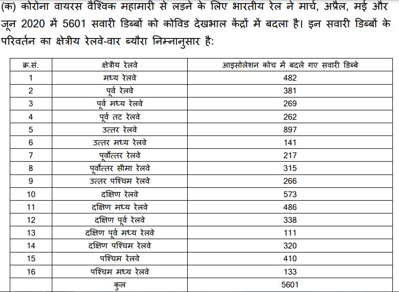 संसद के मानसून सत्र में बीते साल सितंबर में सांसद पी एल पुनिया के सवाल के जवाब में रेल मंत्री पीयूष गोयल ने बताया था कि कोरोना वायरस वैश्विक महामारी से लड़ने के लिए भारतीय रेल ने मार्च, अप्रैल, मई और जून 2020 में 5601 सवारी डिब्बों को कोविड देखभाल केंद्रों के रूप में बदला था. उन्होंने इसका क्षेत्रवार ब्यौरा भी दिया था. (देखें चित्र 1)